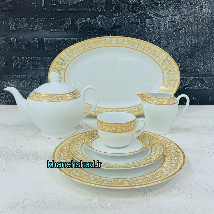 سرویس چینی زرین مهرکرم – طرح گلدانی طلایی و آنتیک، نمونه نایاب و لوکس