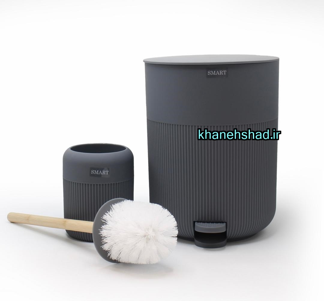 حلقههای چوب بامبو در قسمت بالای بعضی از اجزا (مثل جامایع و جامسواکی) دیده میشود؛ رنگ آنها بین عسلی و کاراملی است و با طوسی سرد بدنه تضاد جذابی میسازد. در تصویر مشخص است که این حلقهها دقیق و همسطح روی بدنه سوار شدهاند؛ نه فاصلهی خالی بین چوب و اکرولیک دیده میشود و نه لبهی تیز آزاردهندهای. این یعنی در مونتاژ، دقت خوبی به خرج رفته است. سطل پدالی حجم متناسبی دارد، نه بیش از حد بزرگ که جا اشغال کند و نه کوچک و نمایشی. انحنای درب، نرم و هماهنگ با بدنه است و پدال در پایین، به رنگ هماهنگ با ست، ساده و جمعوجور طراحی شده است.