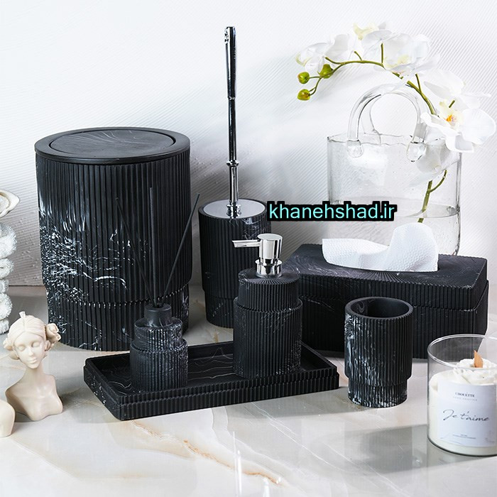 ست سرویس بهداشتی مشکیرنگی که در تصویر میبینید، از جنس کورین ساخته شده و در دسته ست سرویس بهداشتی لوکس، خاص و کاملاً متفاوت قرار میگیرد. رنگ مشکی مات همراه با رگههای سفید ماربل، این ست را به انتخابی عالی برای سرویسهای مدرن، لاکچری، هتلگونه و فضاهایی با نورپردازی حرفهای تبدیل کرده است.