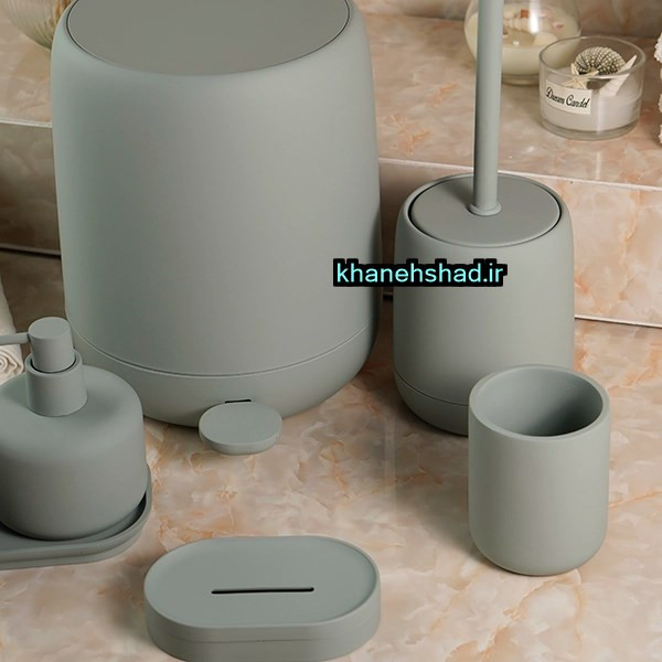 سطل زباله : 1 عدد - فرچه دستشویی : 1 عدد - - جامایعی : 1 عدد - جامسواکی : 1 عدد - جاصابونی : 1 عدد - استند جامایع و مسواک : 1 عدد