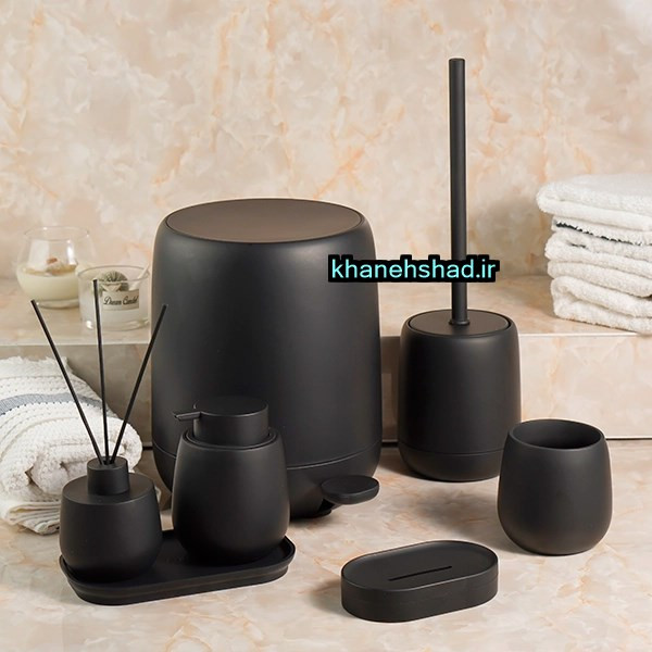 سطل زباله : 1 عدد - فرچه دستشویی : 1 عدد - - جامایعی : 1 عدد - جامسواکی : 1 عدد - جاصابونی : 1 عدد - استند جامایع و مسواک : 1 عدد