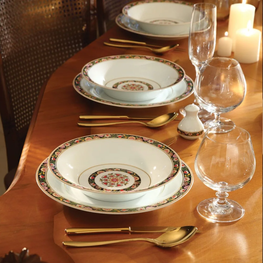 اقلام غذاخوری سرویس: پلوخوری : 6 عدد خورشت خوری : 6 عدد - پیش دستی : 6 عدد - ;کاسه سالاد : 1 عدد - نمکپاش : 2 عدد - دیس : 2 عدد -پیاله : 6 عدد سایز 14 و 6 عدد سایز 18
