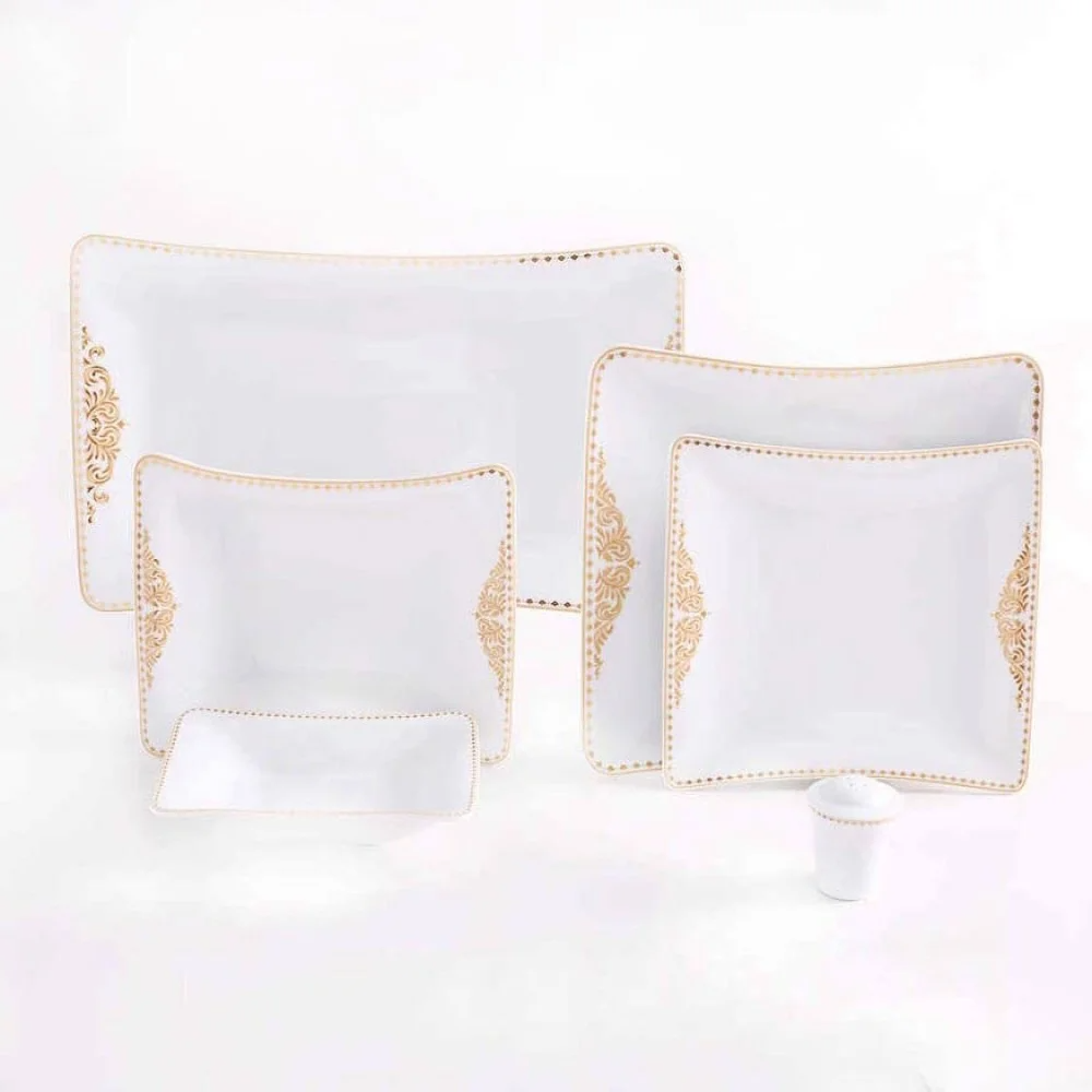 اقلام غذاخوری سرویس: پلوخوری : 6 عدد خورشت خوری : 6 عدد - پیش دستی : 6 عدد - کاسه سالاد : 1 عدد - نمکپاش : 2 عدد - دیس : 2 عدد -پیاله : 6 عدد