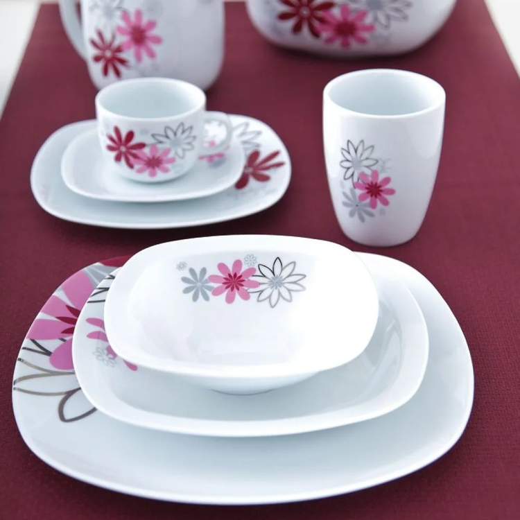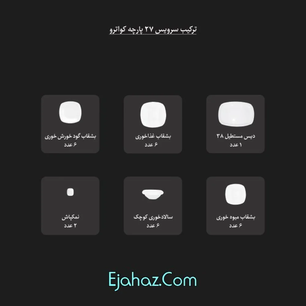 پلوخوری : 6 عدد خورشت خوری : 6 عدد - پیش دستی : 6 عدد - پیاله : 6 عدد - نمکپاش : 2 عدد - دیس : 1 عدد