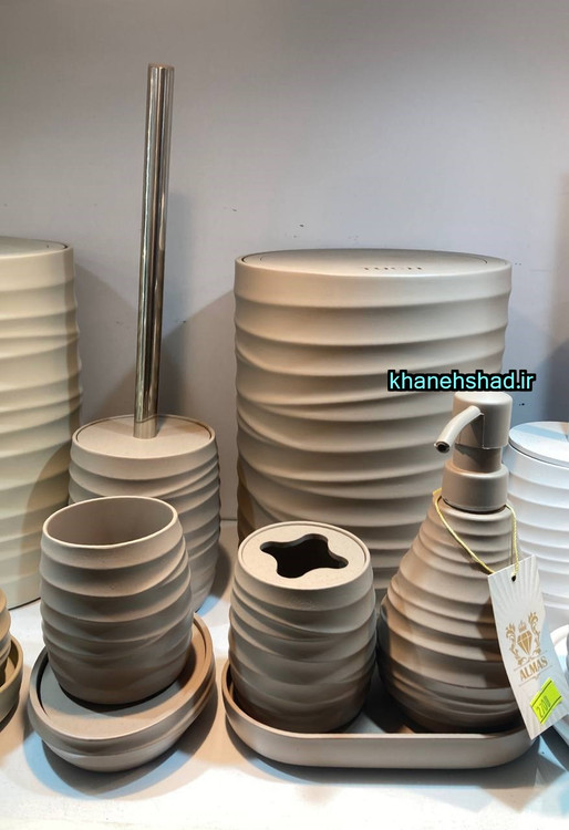 سطل زباله : 1 عدد - فرچه دستشویی : 1 عدد - جامسواکی : 1 عدد - جا لوازم آرایشی و برس : 1 عدد جا مایعی 1 عدد - جاصابونی : 1 عدد