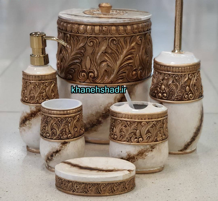 سطل زباله : 1 عدد - فرچه دستشویی : 1 عدد - جا مسواکی : 1 عدد - جا لوازم آرایشی و برس : 1 عدد جا مایعی 1 عدد - جاصابونی : 1 عدد