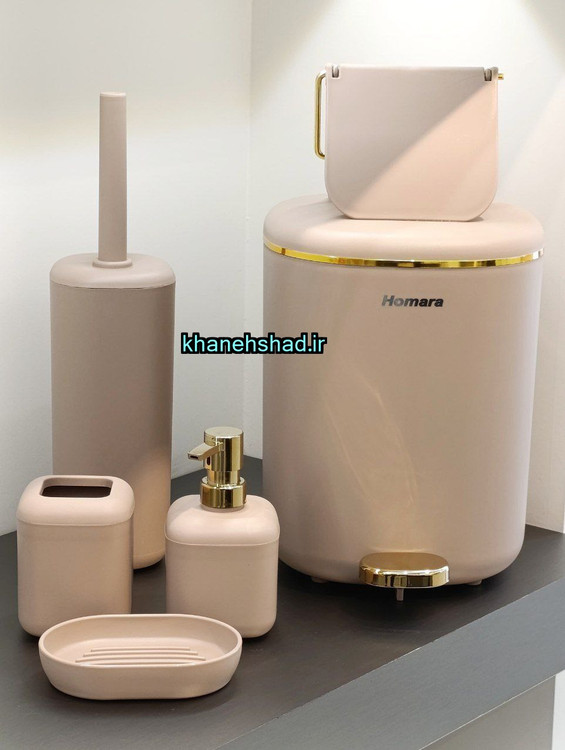 سطل زباله : 1 عدد - فرچه دستشویی : 1 عدد - جا مسواکی : 1 عدد - جا مایعی 1 عدد - جاصابونی : 1 عدد