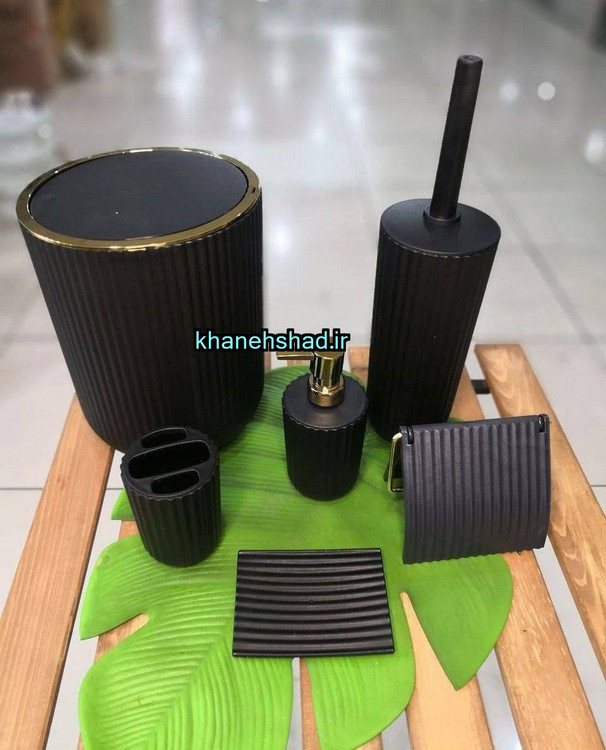 سطل زباله : 1 عدد - فرچه دستشویی : 1 عدد - جا مسواکی : 1 عدد - جا مایعی 1 عدد - جاصابونی : 1 عدد - جادستمالی : 1 عدد