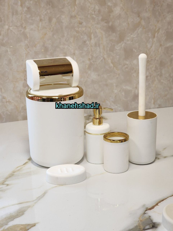 سطل زباله : 1 عدد - فرچه دستشویی : 1 عدد - جا مسواکی : 1 عدد - جا مایعی 1 عدد - جاصابونی : 1 عدد - جادستمالی : 1 عدد