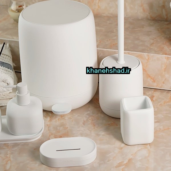 سطل زباله : 1 عدد - فرچه دستشویی : 1 عدد - جادستمالی : 1 عدد - جامایعی : 1 عدد - جامسواکی : 1 عدد - استند جامایع و مسواک : 1 عدد - استند خوشبوکننده : 1 عدد