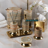 این ست سرویس بهداشتی سنگی اونیکس + استیل طلایی یک انتخاب کاملاً سطح بالا و برای فضاهایی است که قرار است در نگاه اول تأثیر بگذارند.