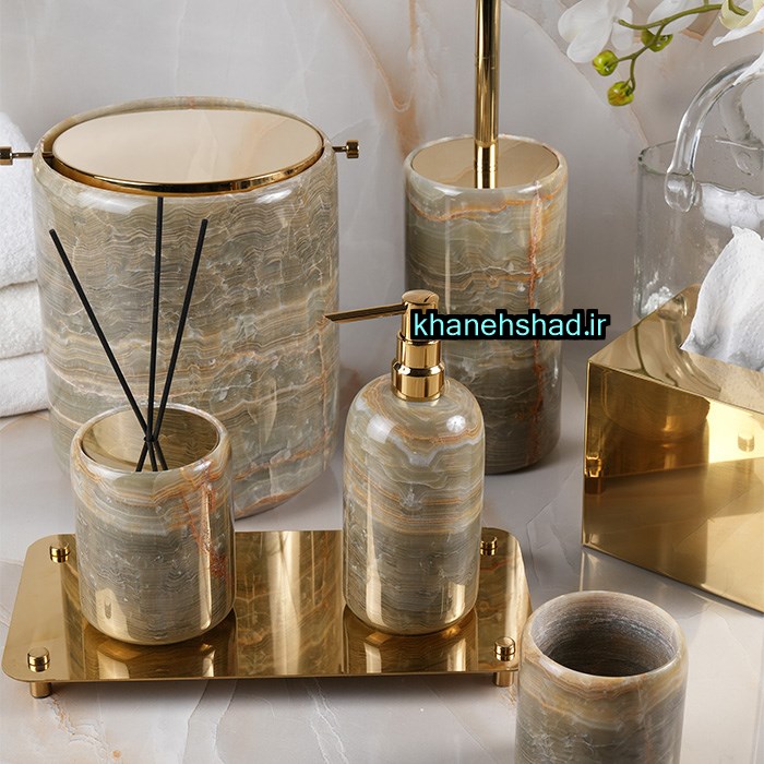 این ست سرویس بهداشتی سنگی اونیکس + استیل طلایی یک انتخاب کاملاً سطح بالا و برای فضاهایی است که قرار است در نگاه اول تأثیر بگذارند.